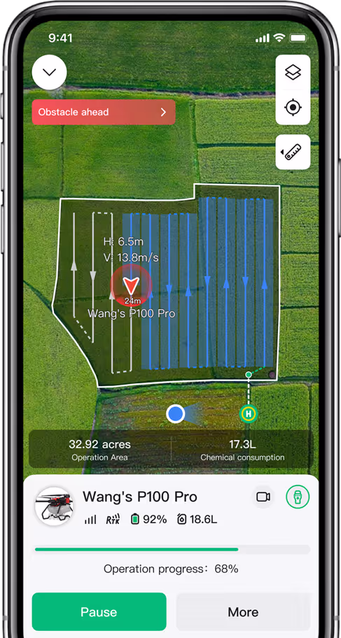 Field obstacle avoidance supports speeds up to 13.8 m/s, ensuring operational safety at high speeds.